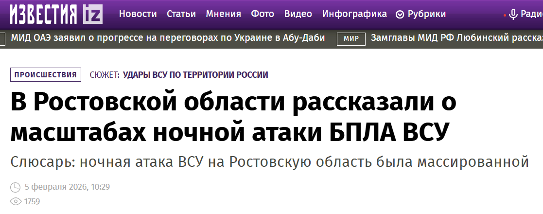 2月5日晚,《消息报》援引罗斯托夫州长尤里·斯柳萨尔在电报频道发布的消息称,乌克兰武装部队对罗斯托夫地区实施了大规模的夜间袭击。